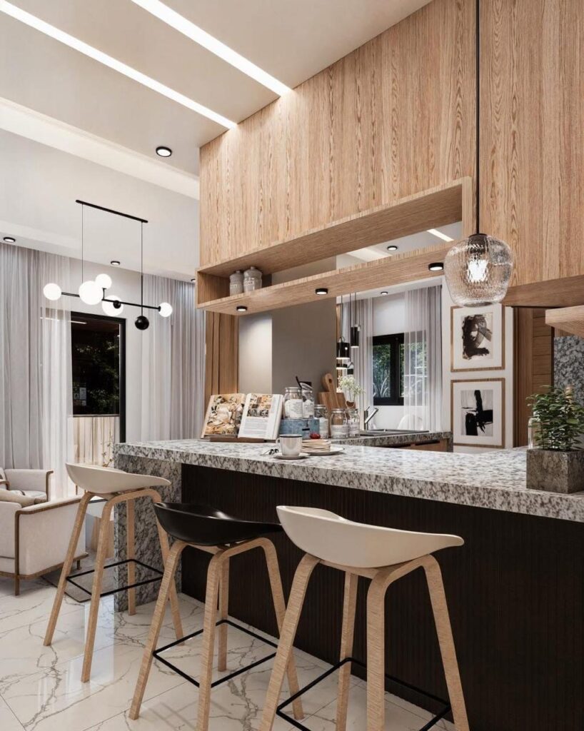 Cocina con desayunador, despensa, baño de visita, topes en granito, gabinetes en melamina hidrófuga